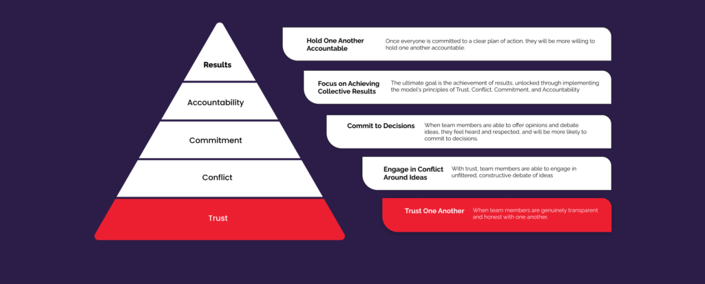 The ultimate goal is the achievement of results, unlocked through implementing the model's principles of Trust, Conflict, Commitment, and Accountability.